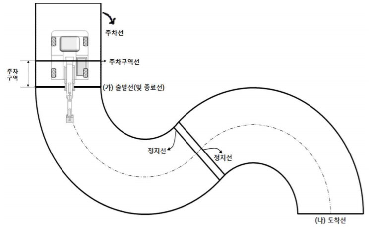 - 전진 주행이 끝난 지점에서 후진 주행으로 앞바퀴가 (가)종료선을 통과할 때 까지 운전하여 출발 전 장비 위치에 주차합니다.