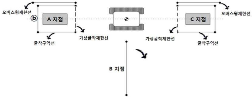 - 주어진 장비(타이어식)를 운전하여 운전석쪽 앞바퀴가 중간지점의 정지선 사이에 위치하면 일시정지한 후, 뒷바퀴가 (나)도착선을 통과할 때 까지 전진 주행합니다.